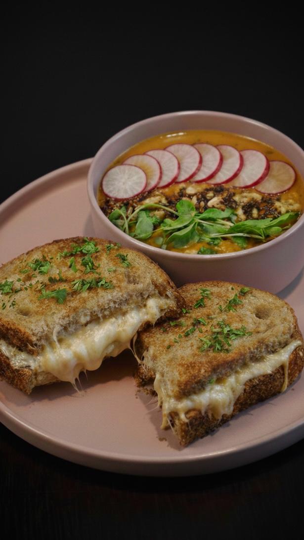 Nuestra clásica y deliciosa crema de zapallo, coronada con trozos de queso de cabra, nueces caramelizadas, rúgula y aceite de oliva. Acompañada con un crujiente grilled cheese de queso cheddar.