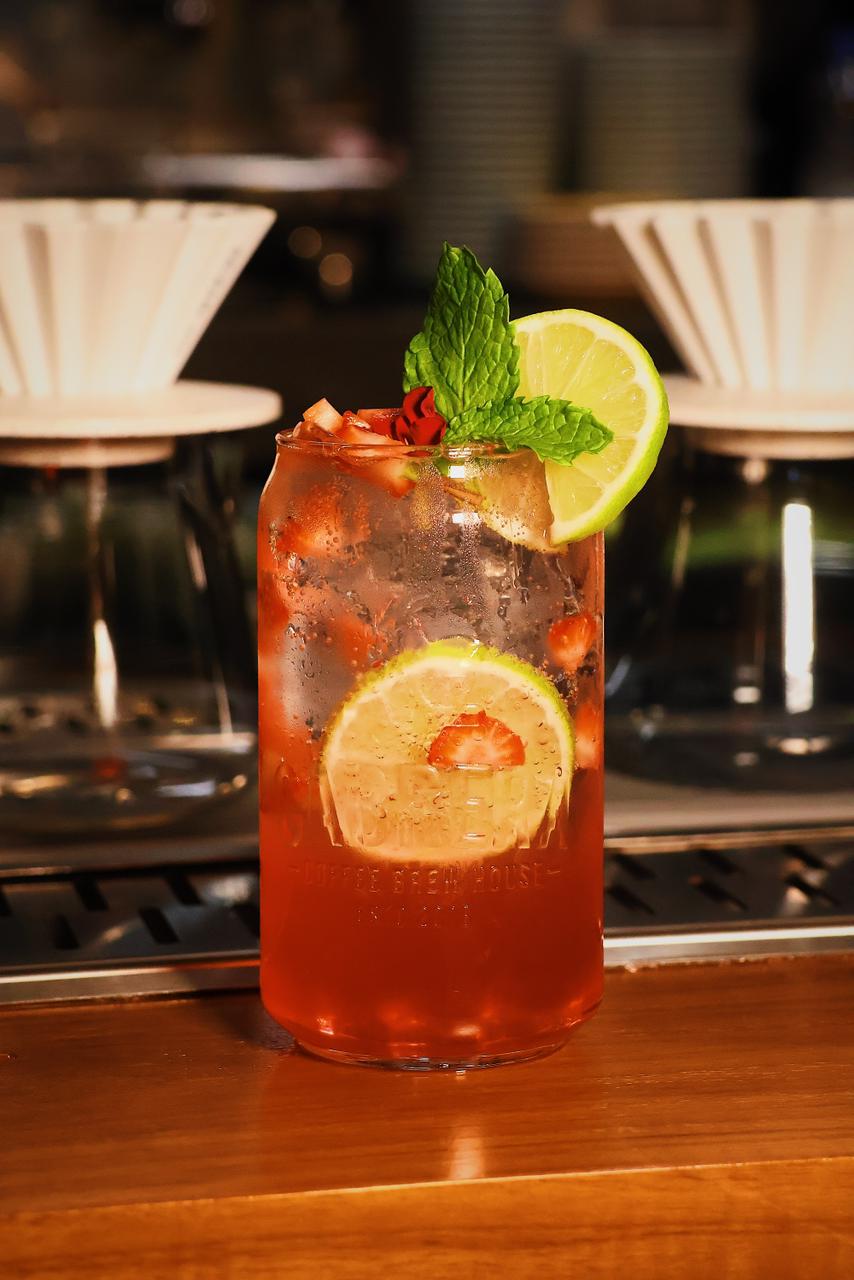 Refrescante soda artesanal de verano con agua carbonatada, sirope de sandía, fresa natural y un toque de zumo de limón.